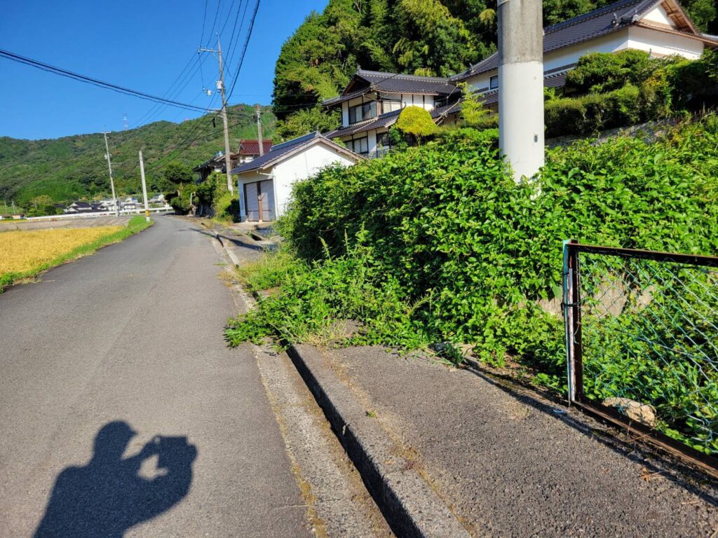 しばらくいくと、空き家の前辺りの歩道には、畑からのつる草が伸びて、歩道を横切っている。