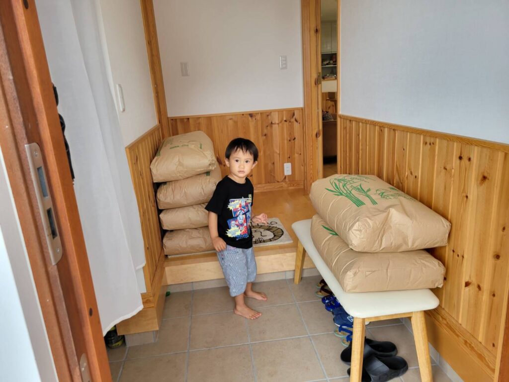 孫のイッセイ君が、玄米を積んだ玄関先で、出迎えてくれた。