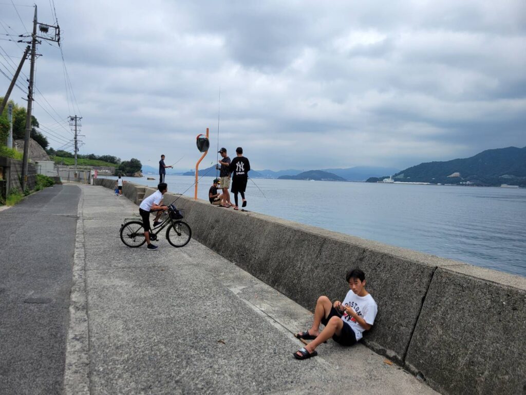近くの海浜では、子どもたちが、イカヅリを楽しんでいた。