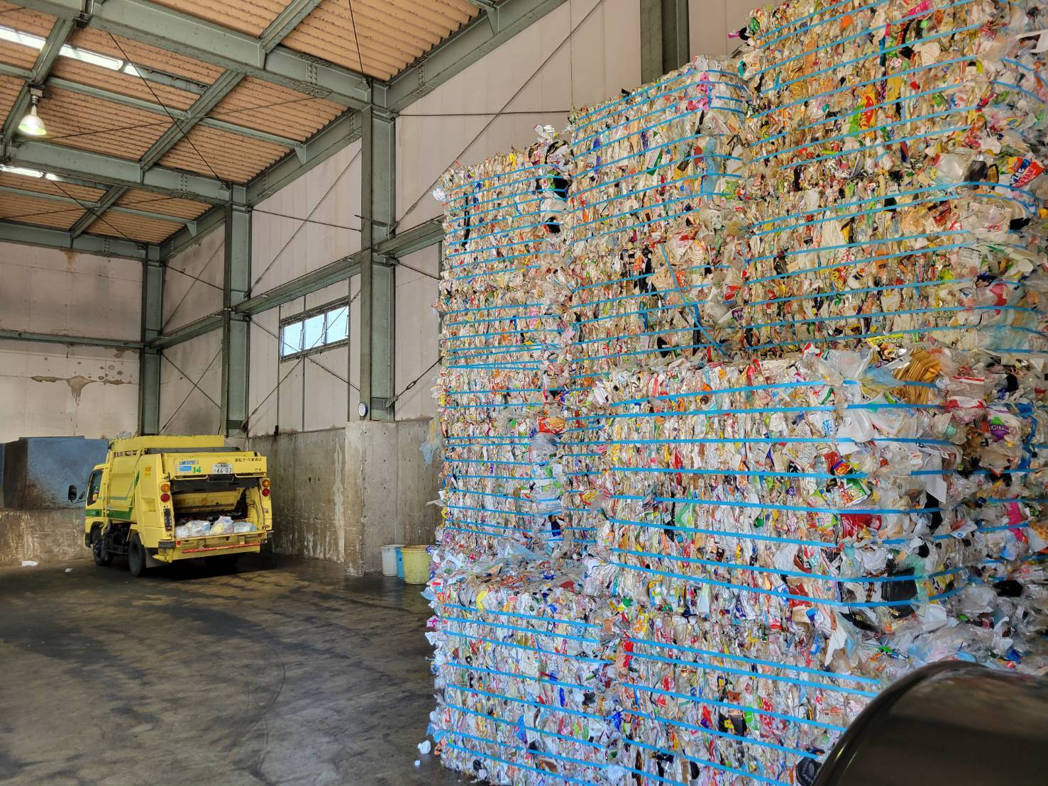 その隣には、四角にプレスされた「プラスチック」の塊が、山ほど積まれている。