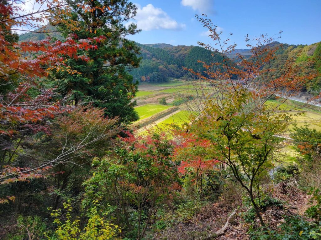 稲刈りした圃場のヒコバエの黄色が、手前の紅葉葉で引き立てられ、この里の広さを感じさせてくれる。